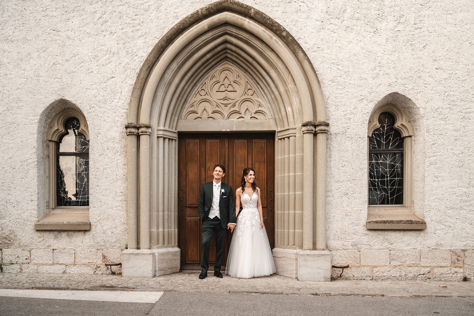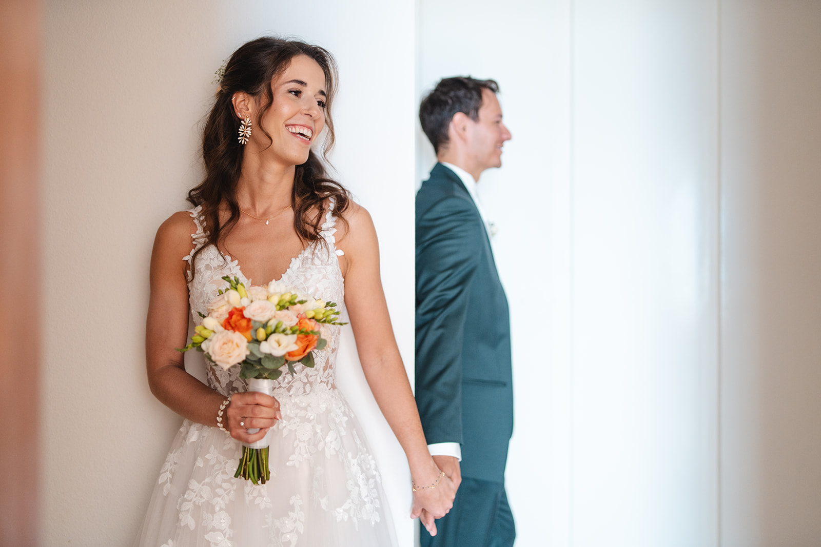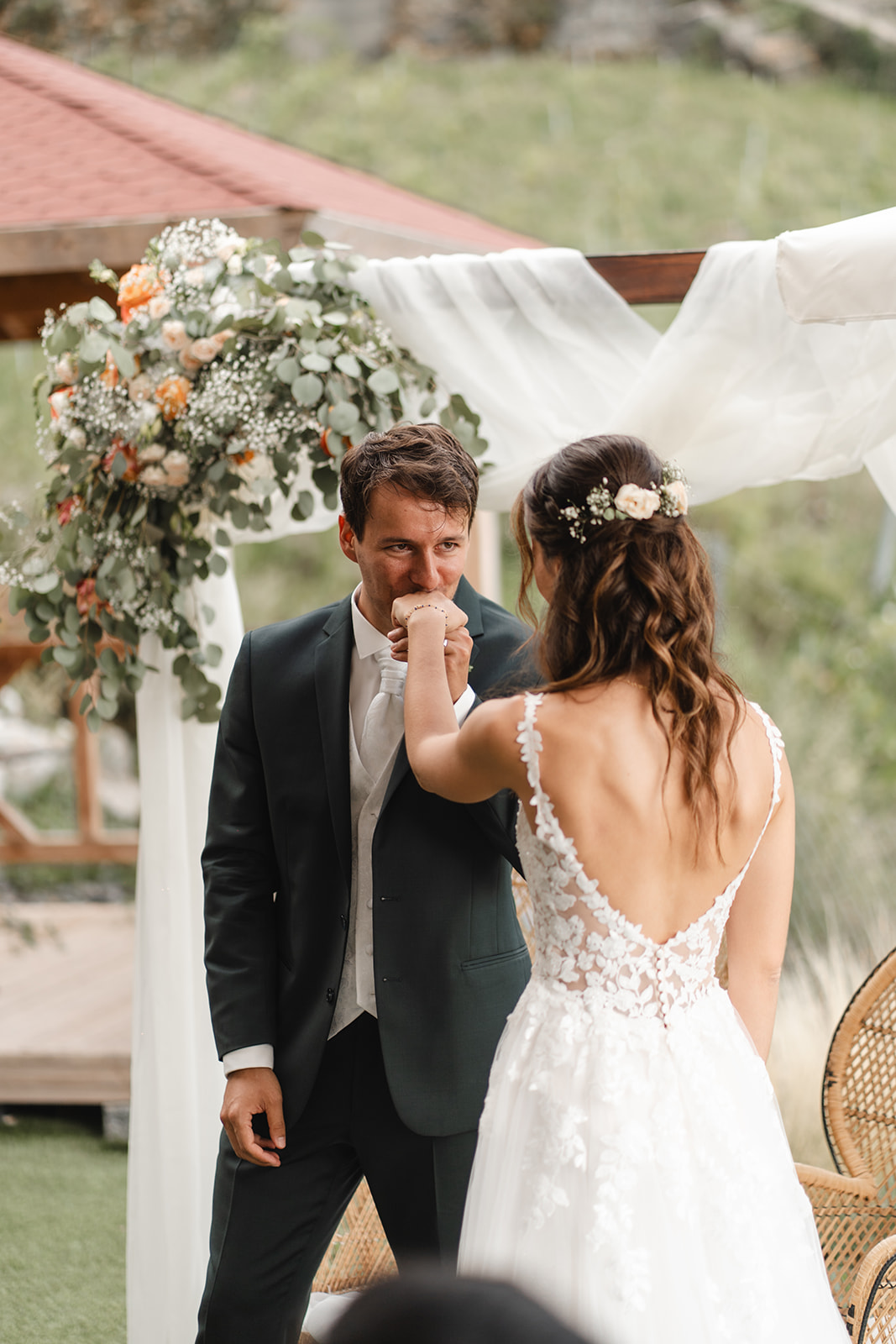 Avant la cérémonie, Katia et Hugo ont choisi un first touch plein de douceur : sans se voir, ils se sont simplement tenus la main quelques instants, laissant l’émotion circuler avant de se retrouver à l’autel.