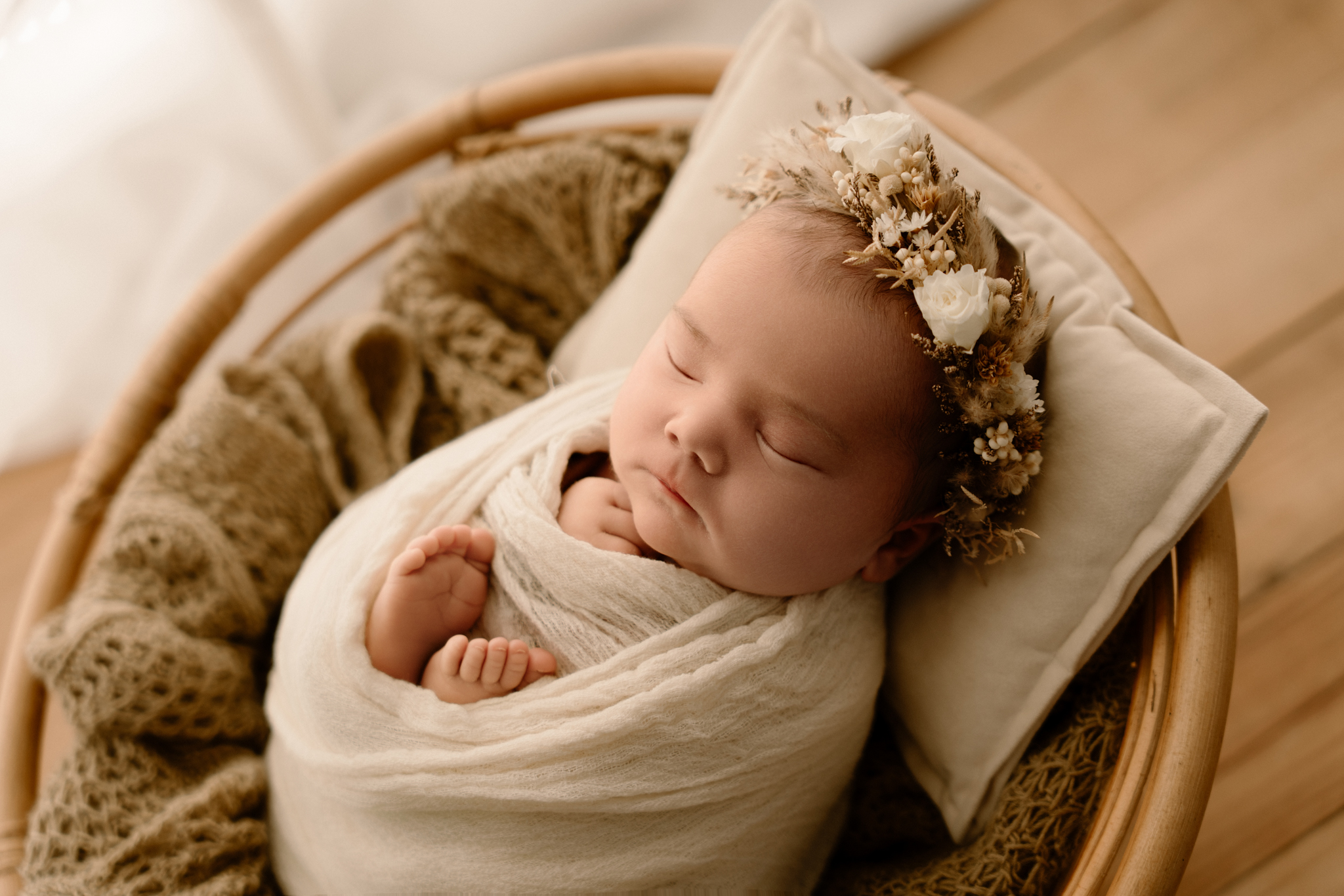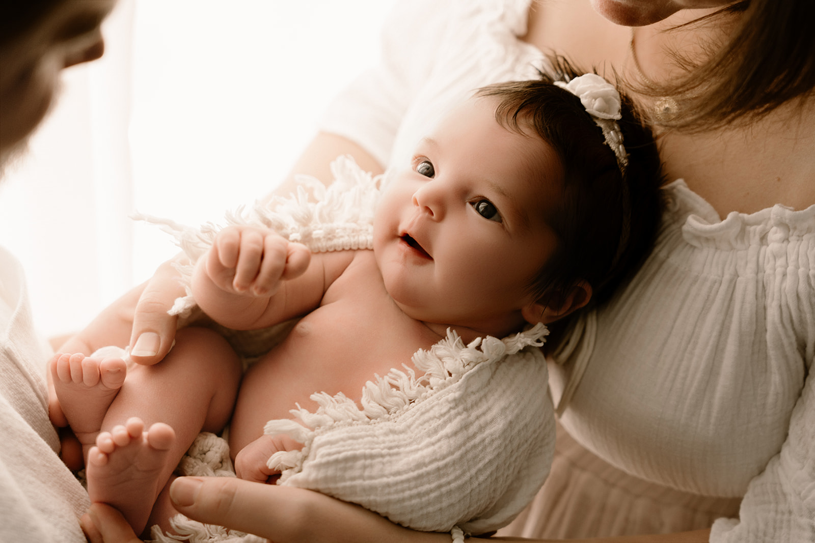 Shooting de 2 à 3h environ, au rythme de votre bébé dans une ambiance cocooning incluant selon les envies :