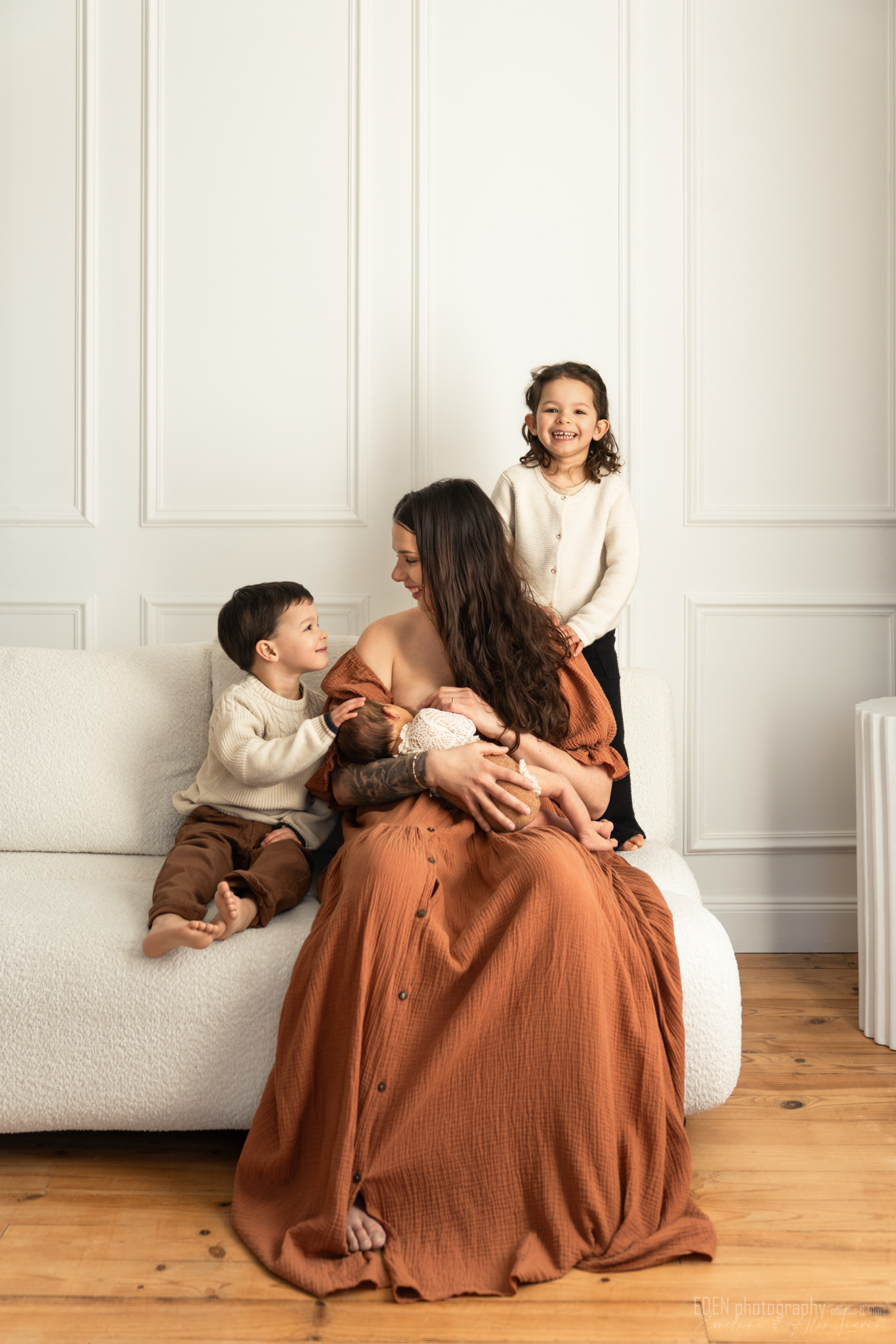Nous ferons des photos de famille avec les parents (et les ainés) sur la majorité de la séance, bébé a souvent besoin de beaucoup de présence, c’est lui qui donne le rythme